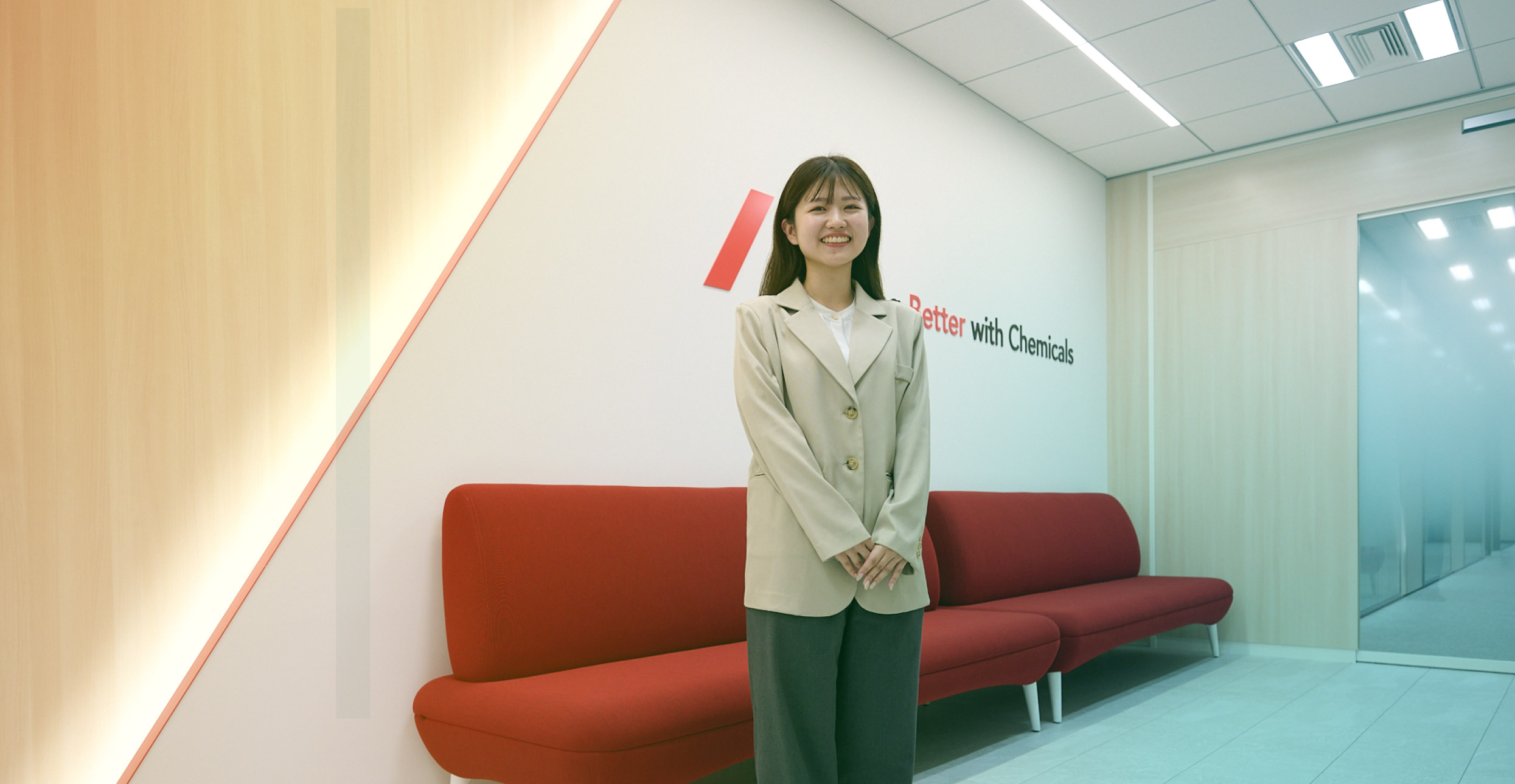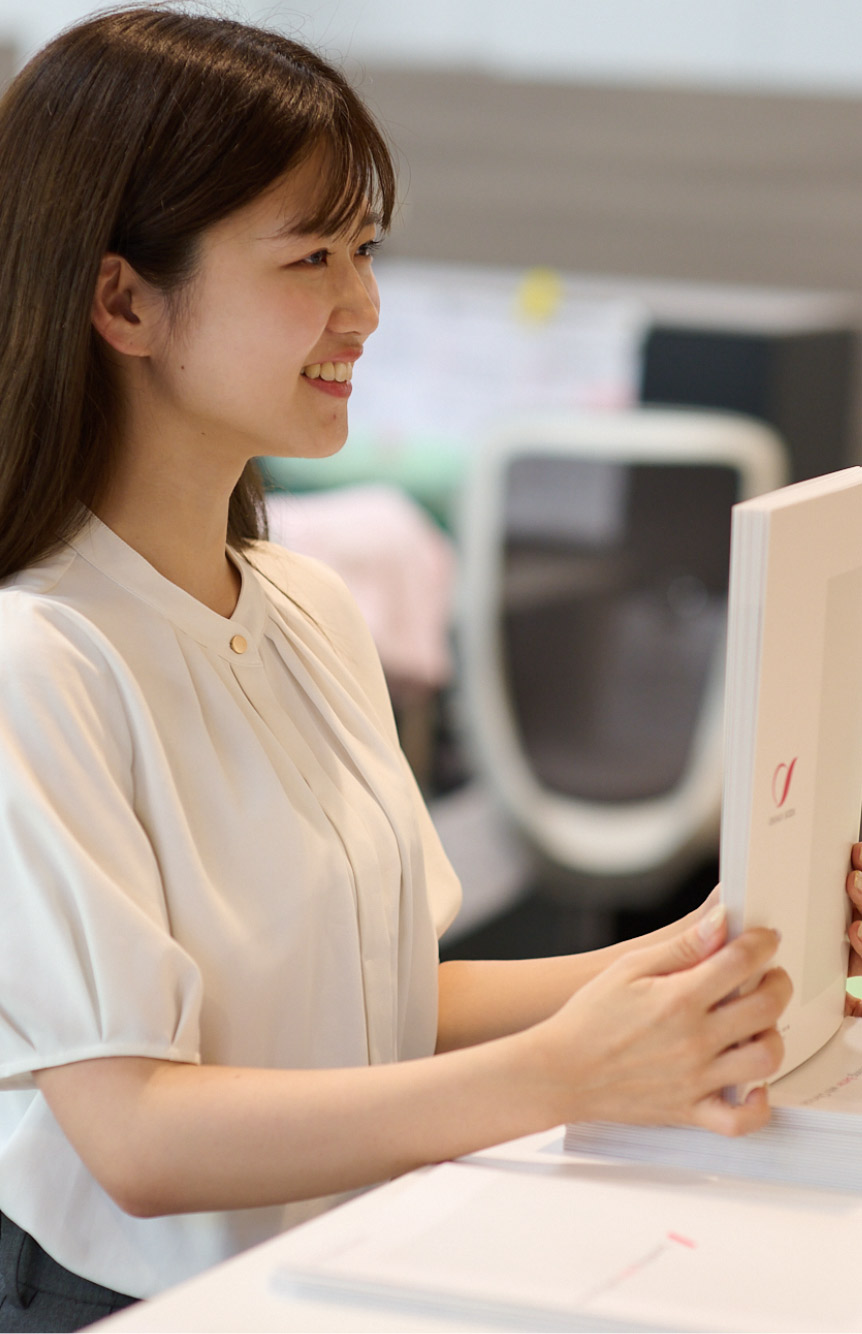 巨大な配管や、いくつもの製造設備がある大きな工場。そこから生み出される「なくてはならない製品」の数々。工場や研究センターなど、製品を生み出すスケール感の大きな舞台で人事として携われることが、この仕事の魅力だと感じています。製品に直接触れることのない業務ではありますが、採用という立場から化学メーカーのスケール感や迫力をたくさんの方へ伝えていければと思っています。もちろん、面接時から常々感じている人のあたたかさを含めて、会社の雰囲気も感じてもらえたら嬉しいですね。学生さんたちには、私とのやりとりを通して「学部に関わらず色々な職種の選択肢があるんだ」と知っていただき、キャリアを考える上での参考にしてもらえたらという気持ちで接しています。