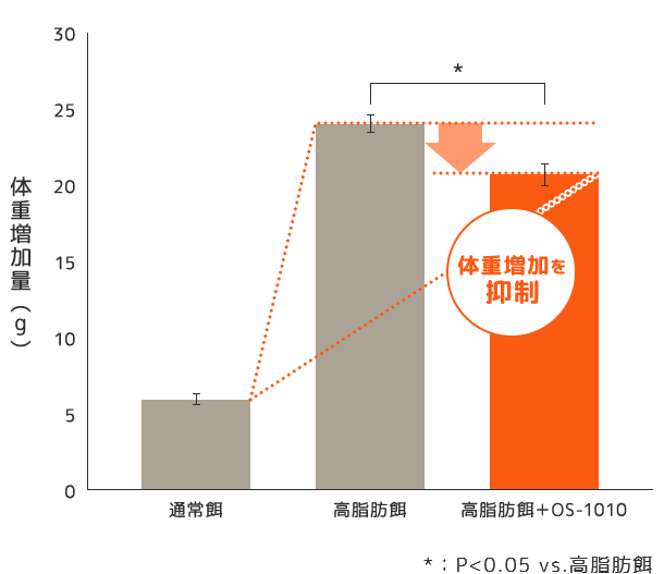 マウス試験を通じて、植物性乳酸菌OS-1010™摂取群が高脂肪⾷群に対して体重増加の抑制効果が確認された。
