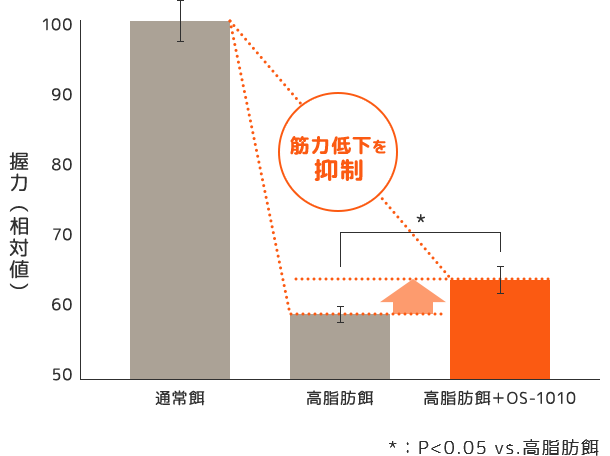 マウス試験を通じて、植物性乳酸菌OS-1010™摂取群が高脂肪食群に対して、握力を有意に抑制。